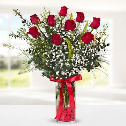 Silindir cam vazo içerisinde kırmızı gül, cipsofilya ve yeşillikler ile hazırlanmıştır.