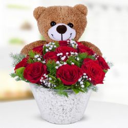 Cam Vazoda 10 Kırmızı Gül ve Ayıcık