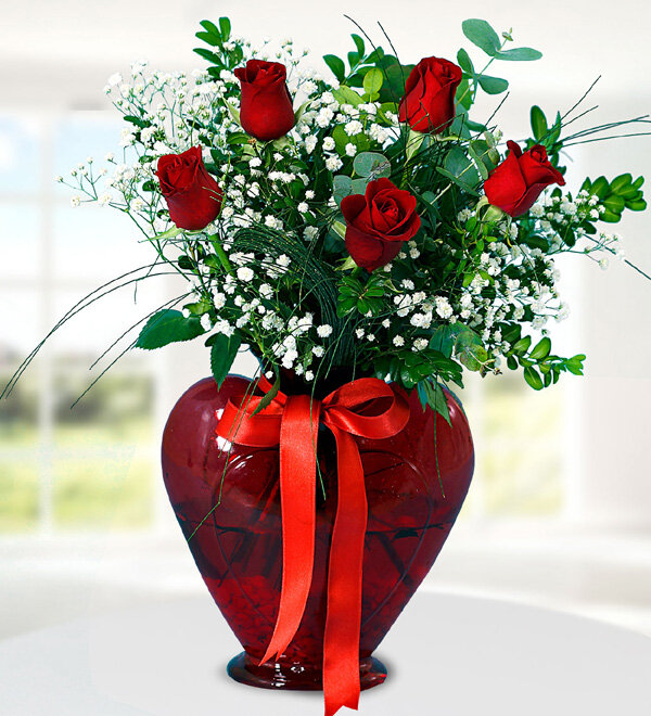 Kalp cam vazo içerisinde kırmızı gül, cipsofilya ve yeşillikler ile hazırlanmıştır.