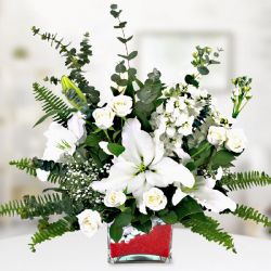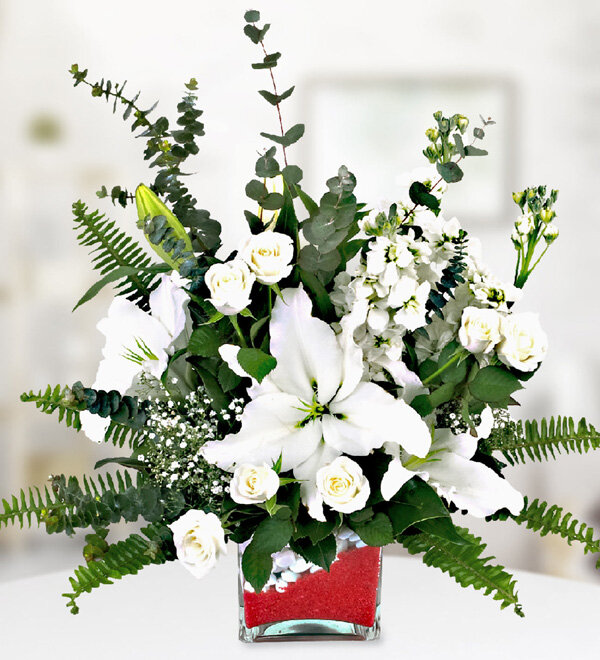 Kare cam vazoda beyaz kazablanka lilyum, beyaz gül ve beyaz şebboy ile hazırlanmıştır.