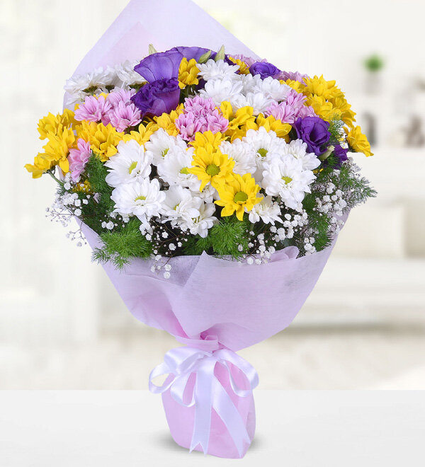 Beyaz, sarı ve pembe papatyalar ile hazırlanmış zarif el buketi.