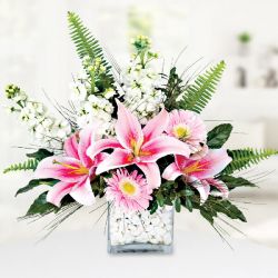 Kare cam vazoda pembe kazablanka lilyum, pembe gerbera ve beyaz şebboy ile hazırlanmıştır.