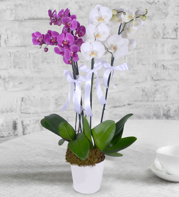 Seramik saksı içerisinde çift dal mor ve beyaz orkide ile hazırlanmıştır