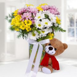 Silindir cam vazo içerisinde renkli papatya, sevimli ayıcık ve çeşitli yeşillikler ile hazırlanmıştır.