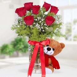 Silindir cam vazo içerisinde kırmızı gül, peluş oyuncak, cipsofilya ve yeşillikler ile hazırlanmıştır.