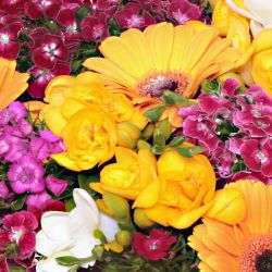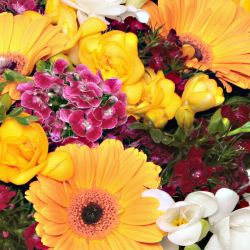 Silindir cam vazo içerisinde gerbera ve mevsimin taze kır çiçekleri ve yeşillikler ile hazırlanmıştır.